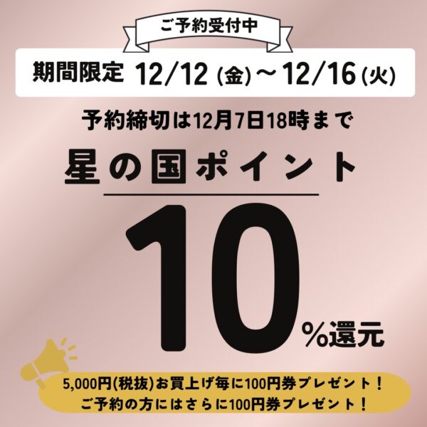第一弾は12月12日(金)~12月16日(火)まで🎵※第二弾は12月26日(金)~12月29日(月) 通常お買い上げ100円(税抜)→1ポイント10%還元セール期間中は100円(税抜)→10ポイントも付い […]